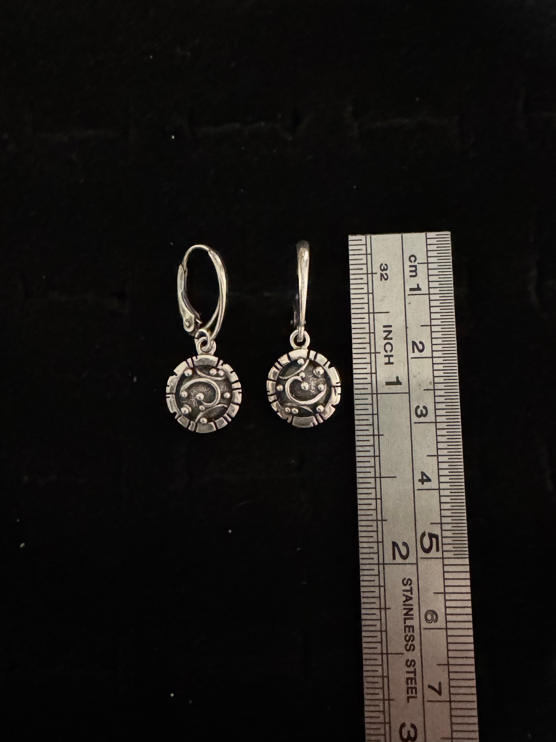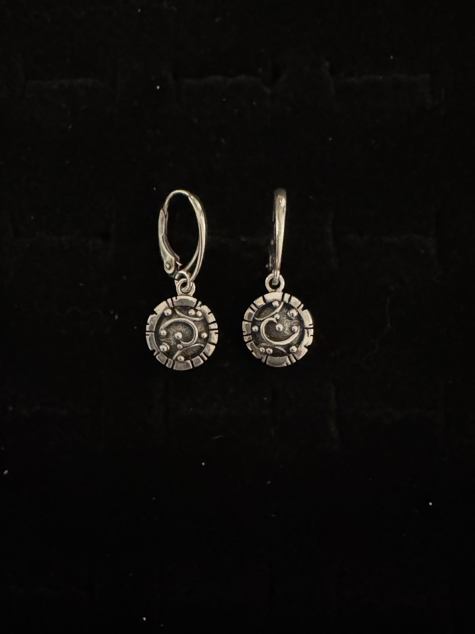 Handcrafted in solid sterling silver, these round drop earrings reinterpret the feather‑inspired design with a smooth polished surround and richly textured center. The darkened, oxidized backdrop brings every ridge and surface into sharp relief.