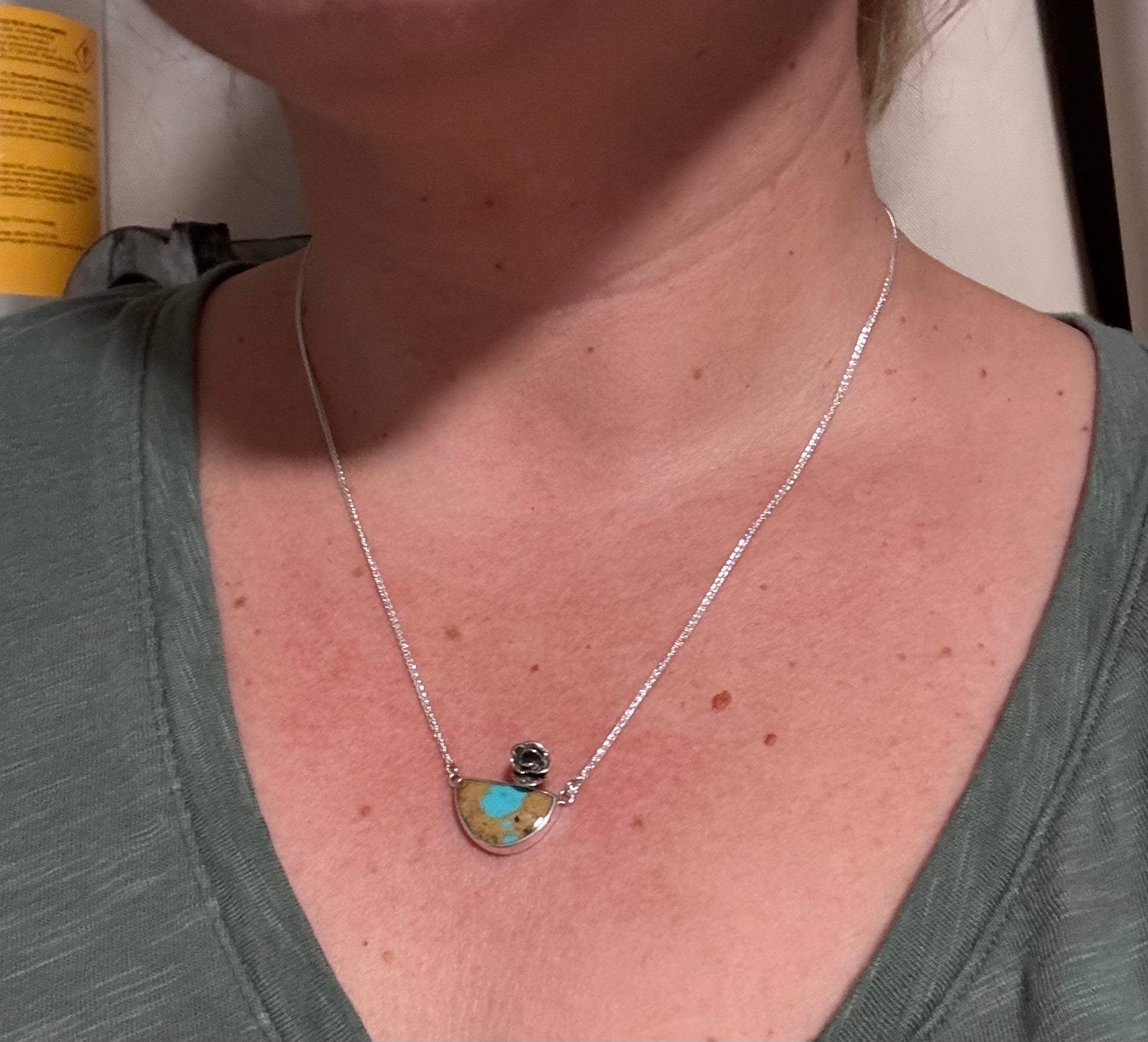This one-of-a-kind pendant features a semi-circle of Royston turquoise — its natural matrix left untouched — crowned with a succulent bloom cast from a real plant. Framed in sterling silver, this piece holds both softness and grit in tension, like the high desert that inspired it.